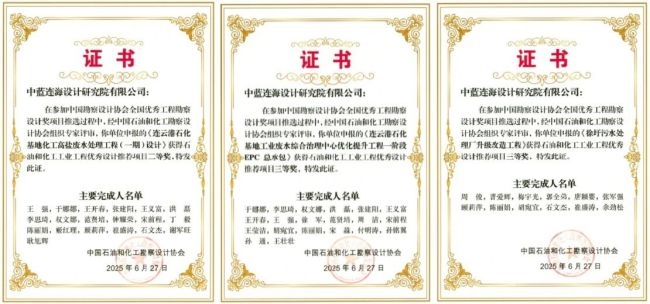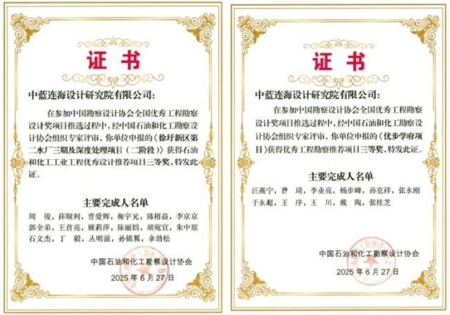 此外,协会还颁发了2025年度优秀工程勘察设计推荐项目获奖证书。中蓝连海申报的“连云港石化基地化工高盐废水处理工程(一期)设计”获化工工程优秀设计项目二等奖;“连云港石化基地工业废水综合治理中心优化提升工程一阶段 EPC 总承包”“徐圩污水处理厂升级改造工程”“徐圩新区第二水厂三期及深度处理项目(二阶段)”分别获化工工程优秀设计项目三等奖;“优步学府项目”获优秀工程勘察项目三等奖。