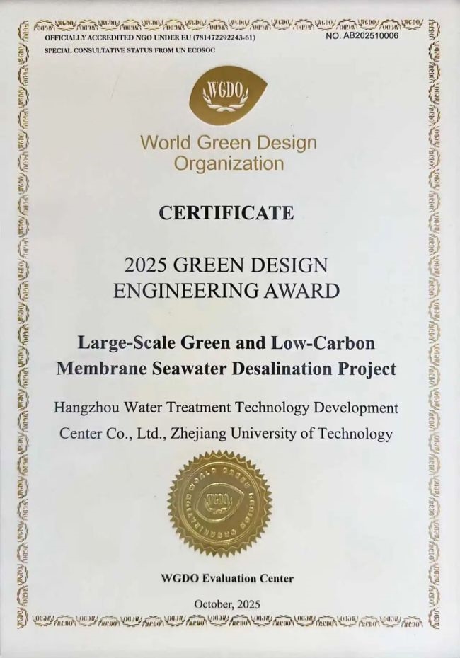 10月14日,由世界绿色设计组织(WGDO)主办的“世界绿色设计大会”在上海召开。会议评选发布绿色设计国际大奖,其中,杭州水处理申报的“大型绿色低碳膜法海水淡化工程”荣获“绿色设计工程奖”,成为全球海水淡化领域绿色创新的典型代表,充分体现出国际权威机构对其在绿色低碳水处理领域技术实力与实践成果的高度肯定。